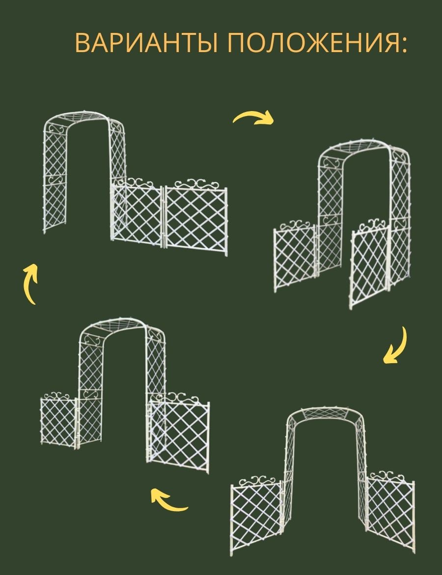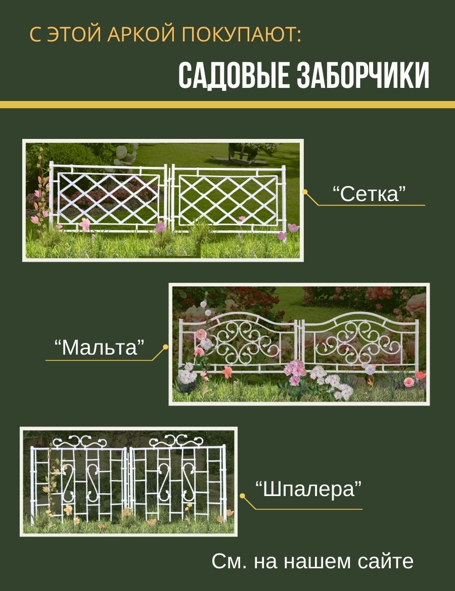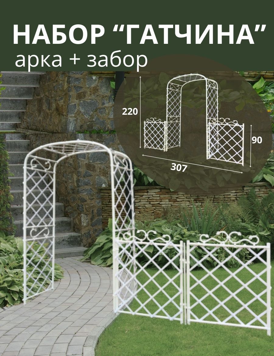 Зная, как наши покупатели трепетно относятся к обустройству и дизайну своих участков, создали комплект из Арки и Забора - набор "ГАТЧИНА". В отличие от предыдущих моделей арок, Гатчина имеет лаконичный и сдержанный дизайн, без завитушек и узоров. Выполнена с использованием садовой пластиковой сетки-шпалеры. Смотрится минималистично и стильно. Так как, арка высокая и широкая можно под ней установить скамейку.