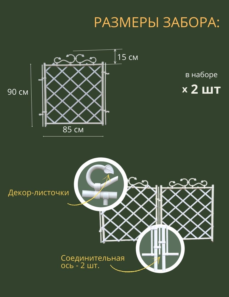 Размеры в собранном виде Арки - 210х130х65 см, Забора (1 секции) - 105х85 см. (высота вместе с узором)