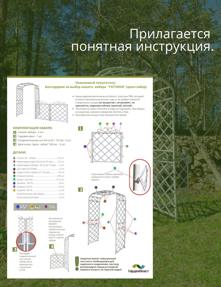 · Наши арки и заборы сконструированы так, что их можно собирать и разбирать легко и просто сколько угодно раз! В конструкции не предусмотрено ни одного самореза - все на защелках (не нужно никакого постороннего инструмента)!