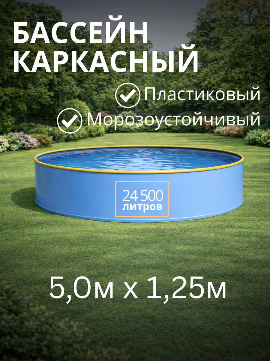 Каркасный бассейн диаметром 5,0 м и высотой 1,25 м — прекрасный большой бассейн для полноценного плавания и активного отдыха для всей семьи и даже включая соседей. Имея этот бассейн на даче люди, как правило, уже не едут искупаться на озеро, речку, карьер. Установить такой бассейн самостоятельно, согласно инструкции, по силам любому человеку с руками. Учитывая большое количество воды и большие нагрузки на борт бассейна ОБЯЗАТЕЛЬНО прикапывать данный бассейн на глубину от 25 см. Зимой можно не разбирать. Возможно подключить систему подогрева бассейна.