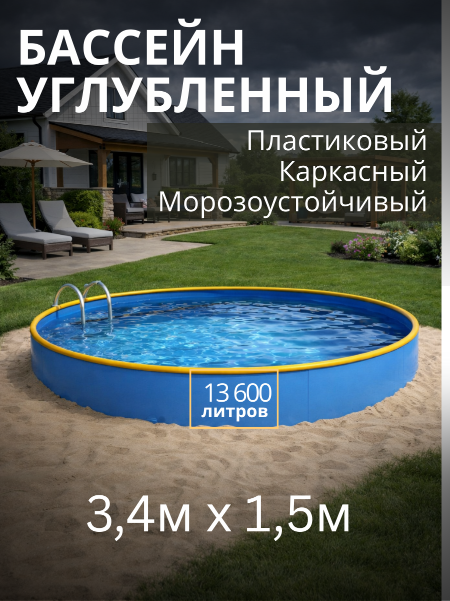 Каркасный бассейн диаметром 3,4 м и высотой 1,5 м — оптимальное решение по размеру для 5-х взрослых человек на даче или загородном участке. Из-за высоты (1,5 метр), использование детьми только под наблюдением взрослых. Учитывая большое количество воды и большие нагрузки на борт бассейна, ОБЯЗАТЕЛЬНО прикапывать данный бассейн на 1/3 от высоты борта. Зимой можно не разбирать. Возможно подключить систему подогрева бассейна.